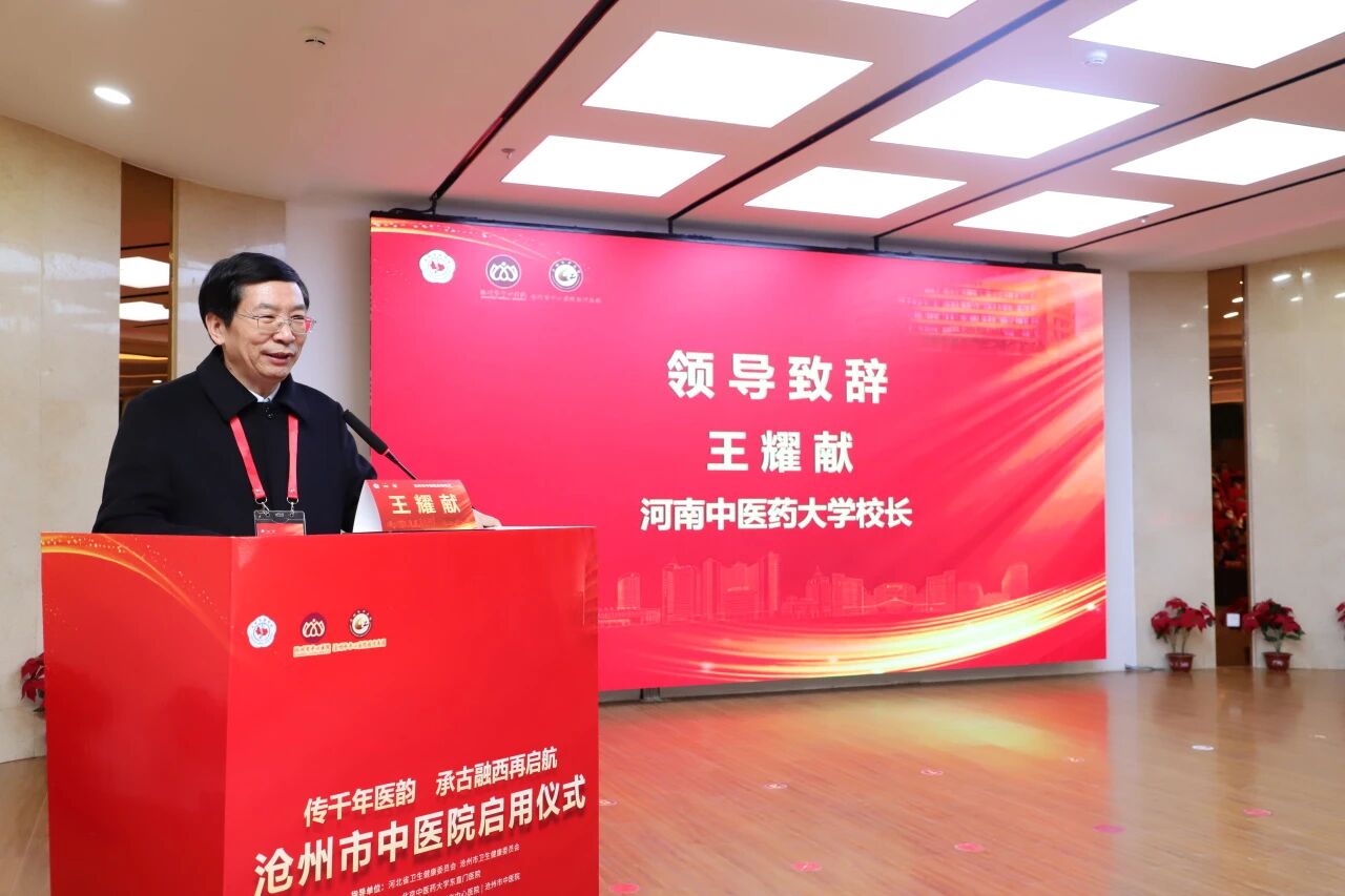 河南中医药大学党委副书记、校长王耀献致辞,作为历史见证者,他用“跌宕起伏,凤凰涅槃”概括了医院从筹备到落成的历程。作为中医药工作者,他称赞了沧州市中心医院为推动中医药事业发展所做的贡献,并表示将依托其设立的工作室,全力支持市中医院发展建设。作为医院管理者,希望医院聚焦百姓迫切需求,以群众满意度作为高质量发展的核心标准;聚焦中医优势病种,坚定中医方向,全力继承好、发展好、利用好中医独特理论和技艺;聚焦中医人才队伍建设,在壮大自身的同时为基层培养输送优秀人才,为医院长远发展奠定坚实基础。